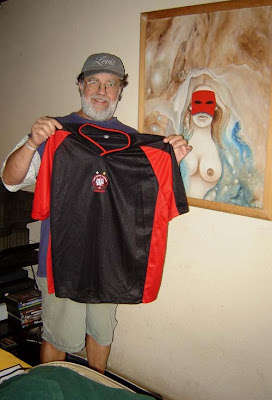 Nosso correspondente (em Santa Teresa), jornalista Toninho Vaz, posa ao lado de duas jóias da sua coleção particular: um quadro do Rones e a camisa do Atlético. Cinco minutos depois do gol de Rafael Moura e vinte minutos antes de começar a escrever a crônica A Elegância de Pedro Oldoni. Foto de Carol.