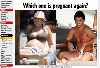 Site do tablóide inglês “The Sun” compara uma foto de Ronaldo só de cuecas com a da cantora Louise Redknapp, grávida de quatro meses de seu segundo filho. A publicação provoca o jogador com e pergunta: Qual dos dois está “grávido” de novo?The Sun