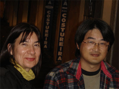 Márcia SQuiba, a nossa querida Marciateca, primeira Diretora da Gibiteca de Curitiba, e Tako-X, cartunista e quadrinista. No Ao Distinto Cavalheiro. Foto de Vera Solda.